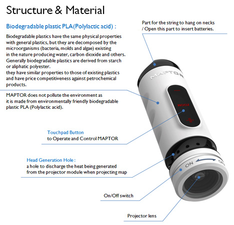 The two students designed this concept and gave it the name Maptor (map and projector). The device combines the characteristics of a map and a projector and that allows it to display a map on any surface, from a wall to the palm of your hand. It can be easily carried around as it has the same size with a lighter and you don’t have to worry if it breaks because it is very compact. With its zooming functions you don’t have to struggle to find roads etc as you would bend over the classic map. So forget carrying around a foldable map or a book with directions!