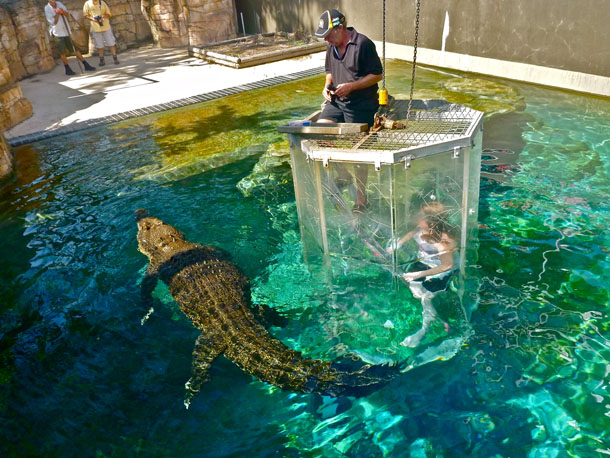 Are you looking for excitement? Then you should go for skydiving, bungee jumping or dive underwater. The latest trend for brave hearts comes from an amusement park in Darwin, Australia. There you can swim face to face with a crocodile! You get inside of a cage which is underwater and crocodiles swim around you. It feels like you can almost touch them….or eat you alive! The cage whic is 6 feet long is called the ‘‘Cage of Death”.