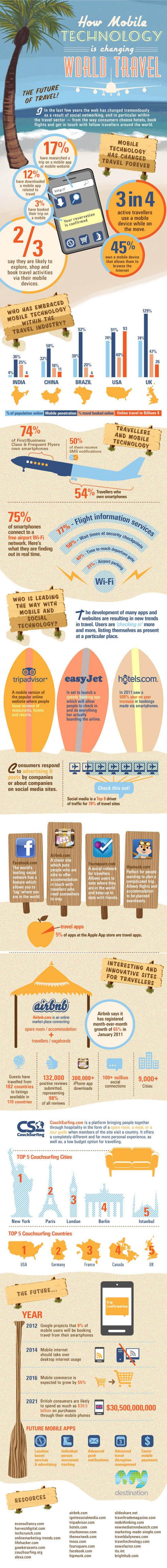 Technology has evovled way too much the past year and is affecting every part of our lives and why not travel too. Today most of people use their mobiles to find information about their destinations, to take photos, to check th weather and even book a flight or acommodation as there is almost an app fro everything. In this travel infographic we can see how much mobile technology has affected theworld travel.